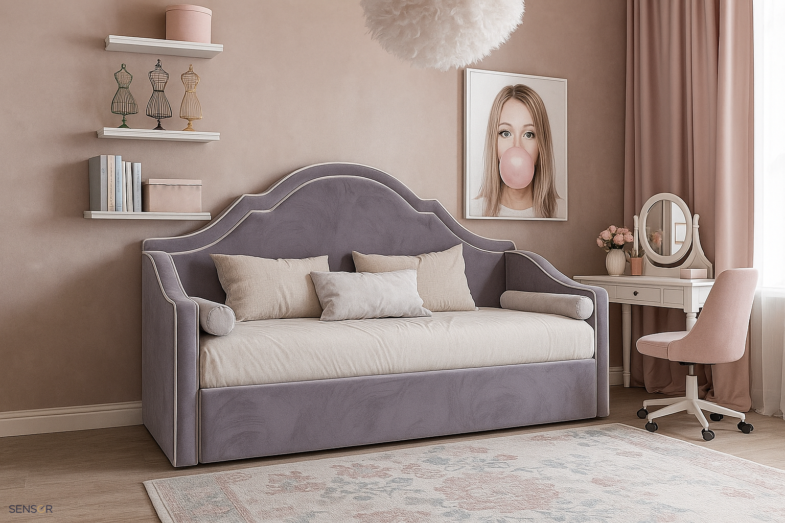 Диван-кровать Альма для современной детской комнаты. Плавные линии, обрамленные декоративным кантом, притягивают взгляд и подчеркивают мягкость дивана. В этой модели, как и в любой другой из каталога фабрики, продуманно все для удобства и комфорта ребенка любого возраста. Диван-кровать это уникальное решение для правильного сна! Модель Альма это лаконичная модель с элегантным дизайном. Есть возможность поиграть цветом декоративного канта, он может быть как однотонным, так и на контрасте. Выбирая изготовление мебели на заказ, вы ни в чем себя не ограничиваете. Изделие изготавливается под ваши размеры, цвет и текстура ткани на выбор, вам будут предложены каталоги дизайнерских тканей от лучших поставщиков на российском рынке.