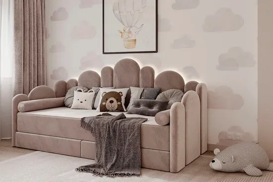 Диван-кровать Бамбини kids - оригинальная дизайнерская модель. Детали спинки напоминают знаменитое печенье Савоярди, каждый элемент изготовлен отдельно опытными руками мастера. Эта модель два в одном, ее удобно использовать как полноценный красивый диван в дневное время, а ночью это правильное спальное место (ортопедическая решетка + ортопедический матрас).