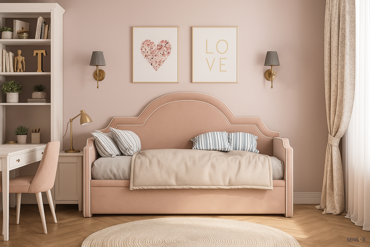 Диван-кровать Бентли для современной детской комнаты. Стильный и комфортный, днём это удобный диванчик, а ночью полноценное спальное место. Плавные линии, обрамлённые декоративным кантом, притягивают взгляд. Есть возможность поиграть цветом декоративного канта, он может быть как однотонным, так и контрастным. Кант добавляет элегантности и стиля. Боковые спинки не имеют острых углов, что очень важно для безопасности. Изготовление диванчика на заказ даёт вам возможность выбирать размер спального места, ткани по цвету и текстуре, создать вариант, который идеально подойдёт для вашего пространства.