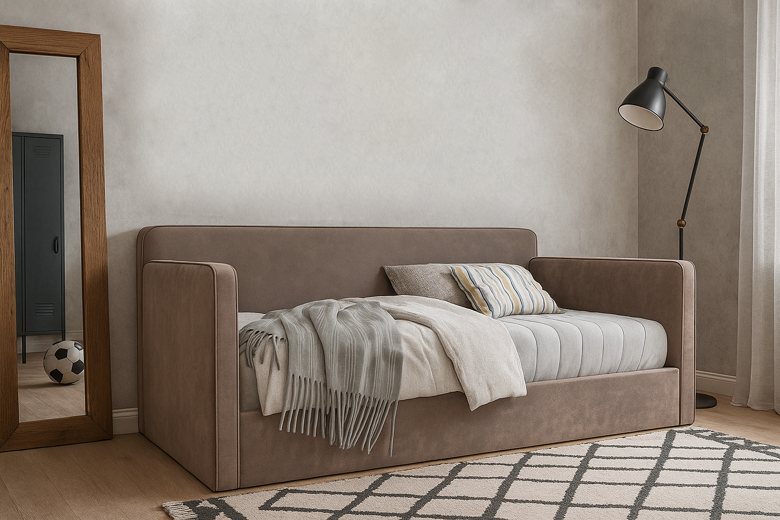 Диван-кровать Бруни kids - спокойный, лаконичный дизайн, идеально впишется в любой интерьер современной детской. Данная модель подойдет для любого возраста, как для девочки так и для мальчика. Модель можно сделать как однотонной, так и с контрастным кантом по периметру спинок.