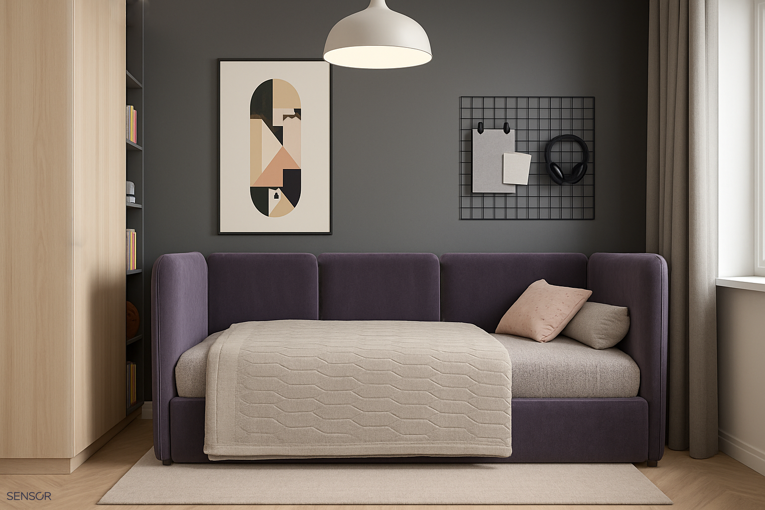 Диван-кровать Флит Дизайн Проект №6 - имеет спокойный, лаконичный дизайн, идеально впишется в интерьер современной детской. Данная модель подойдет для любого возраста, как для девочки так и для мальчика. Модель можно сделать как с однотонным, так и с контрастным кантом по периметру деталей спинки. Интересно выполнена боковая спинка по длине, она состоит из отдельных элементов. Мягкая мебель на заказ от производителя - это возможность индивидуального подбора цвета, размера и дополнительных опций.