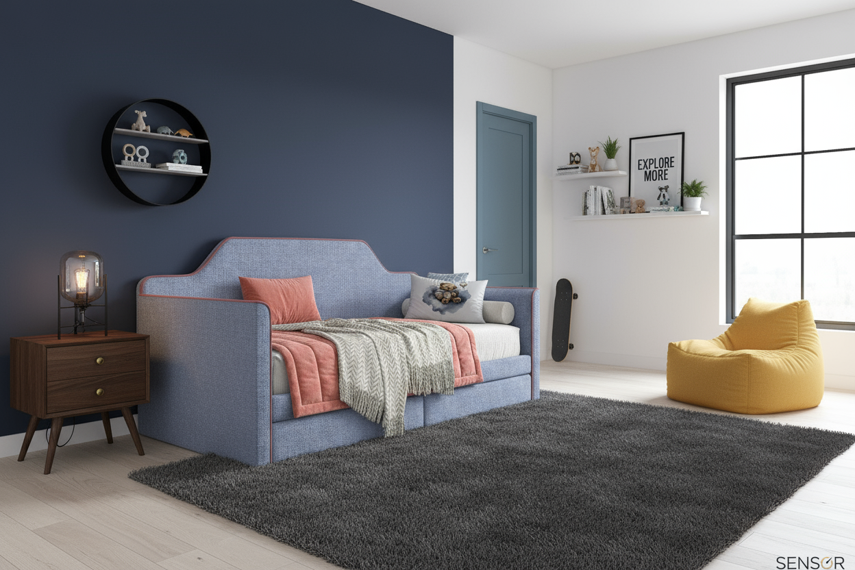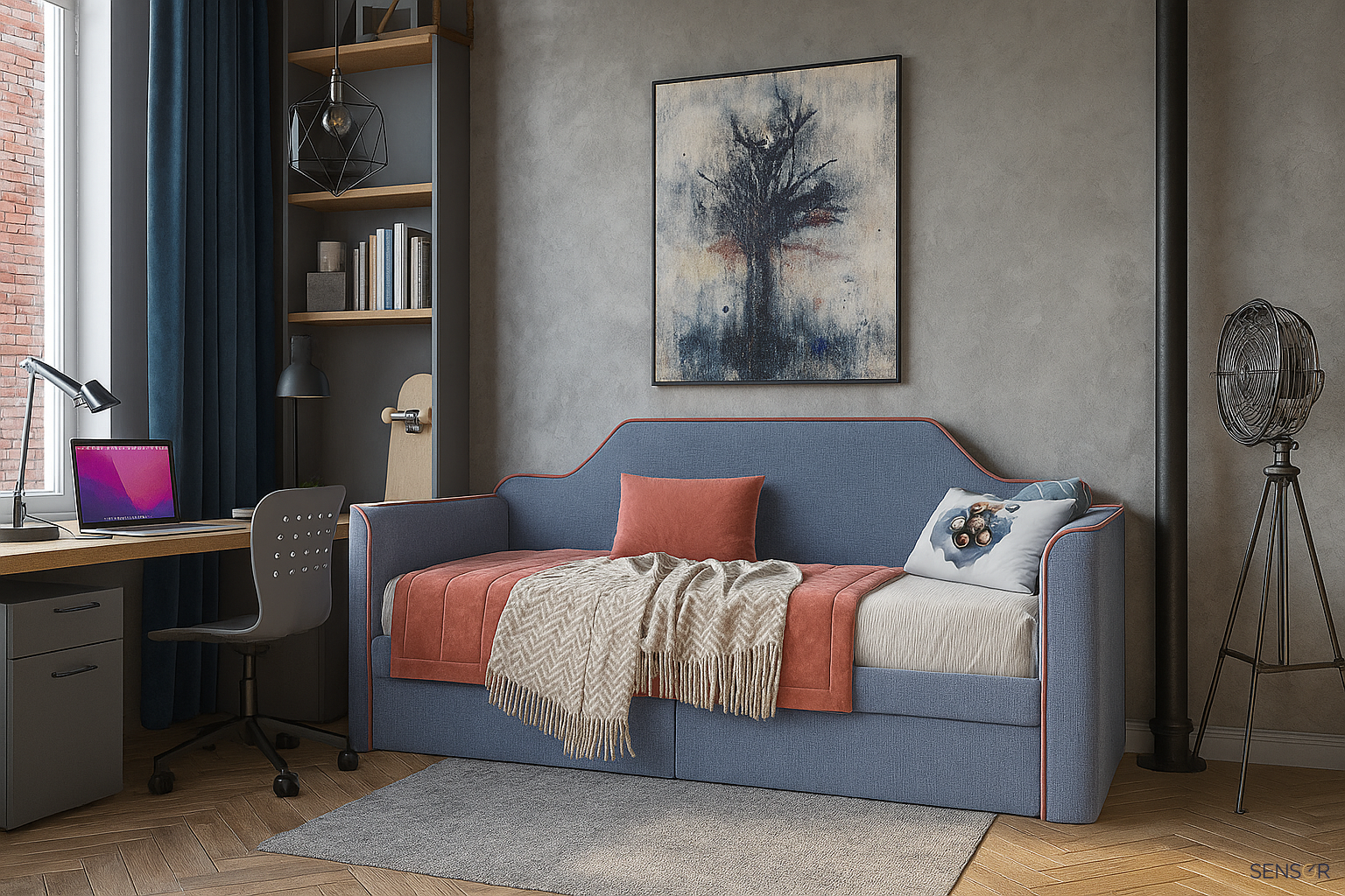 Диван-кровать Леон для детской комнаты. Декоративный кант интересный элемент декора, его можно сделать как однотонным, так и уйти в контрастные варианты. Дизайнерская модель на заказ, мы может изготовить индивидуально для вас, с учётом всех пожеланий и требований. Элегантный диванчик создаст уютную атмосферу в комнате вашего ребенка днём, а ночью это полноценное спальное место с ортопедическом матрасом. Шикарное решение для детской, идеальное сочетание комфорта и функциональности. В шоу-руме фабрики вы можете выбрать цвет и текстуру ткани, посмотреть качество изделий. Менеджеры фабрики вам продемонстрируют вариации спального места на выбор.