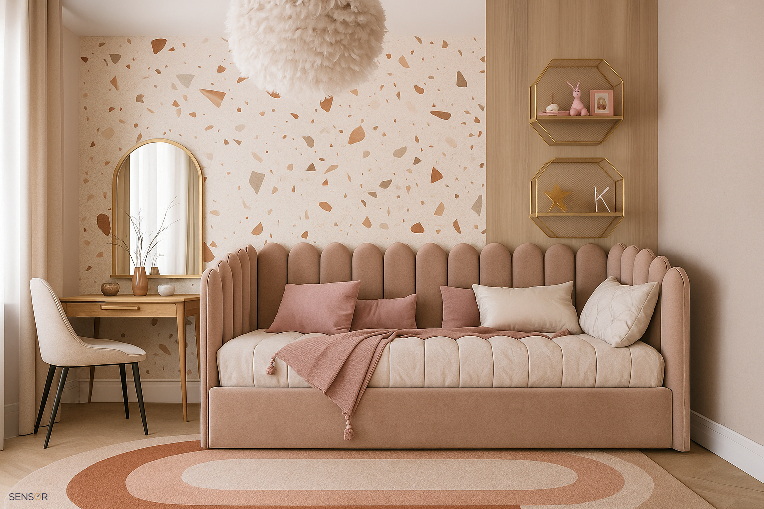 Диван-кровать Савоярди kids -  оригинальная дизайнерская модель. Детали спинки напоминают знаменитое печенье Савоярди, каждый элемент изготовлен отдельно опытными руками мастера. Центральная спинка диванчика ровная, а у боковых спинок элементы разной высоты, рисунок напоминает лесенку. Эта модель два в одном, ее удобно использовать как полноценный красивый диван в дневное время, а ночью это правильное спальное место (ортопедическая решетка + ортопедический матрас).
