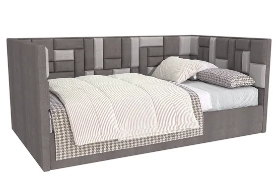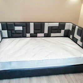 Стоун kids  - рисунок изголовья собран из отдельных геометрических фигур. Квадраты стильно дополняют прямоугольники, а мелкие, средние и крупные формы прекрасно сочетаются. Каждая деталь изготавливается отдельно, затем по принципу мозаики выкладывается рисунок изголовья. Геометрические формы создают атмосферу упорядоченности и гармонии.