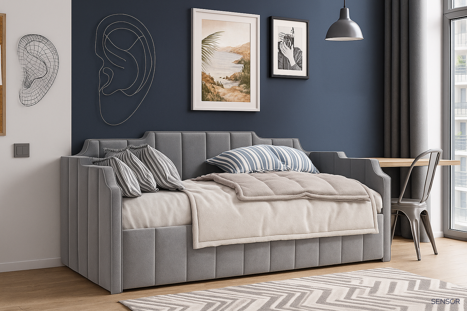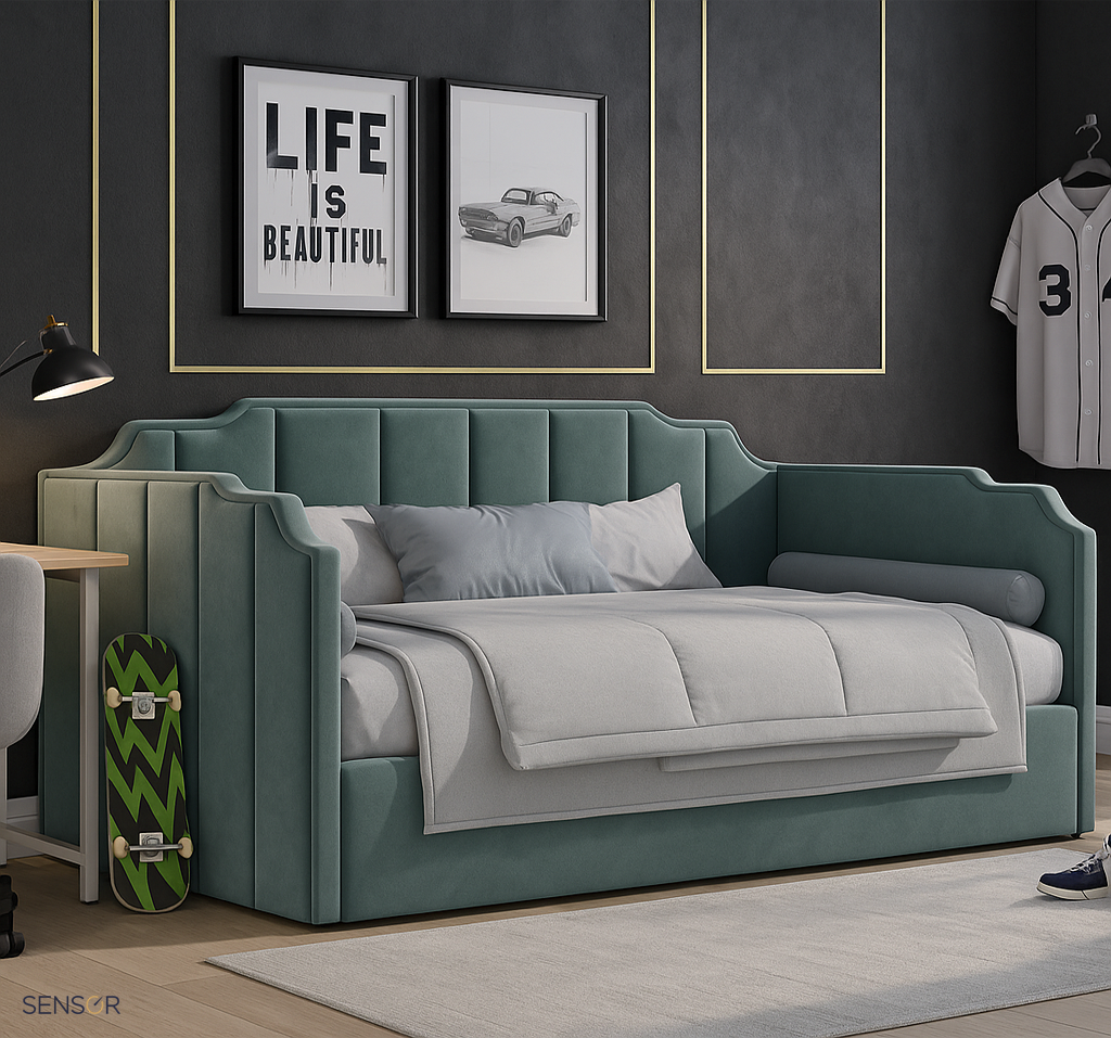 Диван-кровать Теодор для современной детской комнаты. Стильная модель, без лишних деталей, все продуманно до мелочей. Прекрасно впишется в комнату подростка, подойдет в интерьер как для девочки так и для мальчика. Большой выбор дизайнерских тканей позволит подобрать именно ваш вариант по цвету.