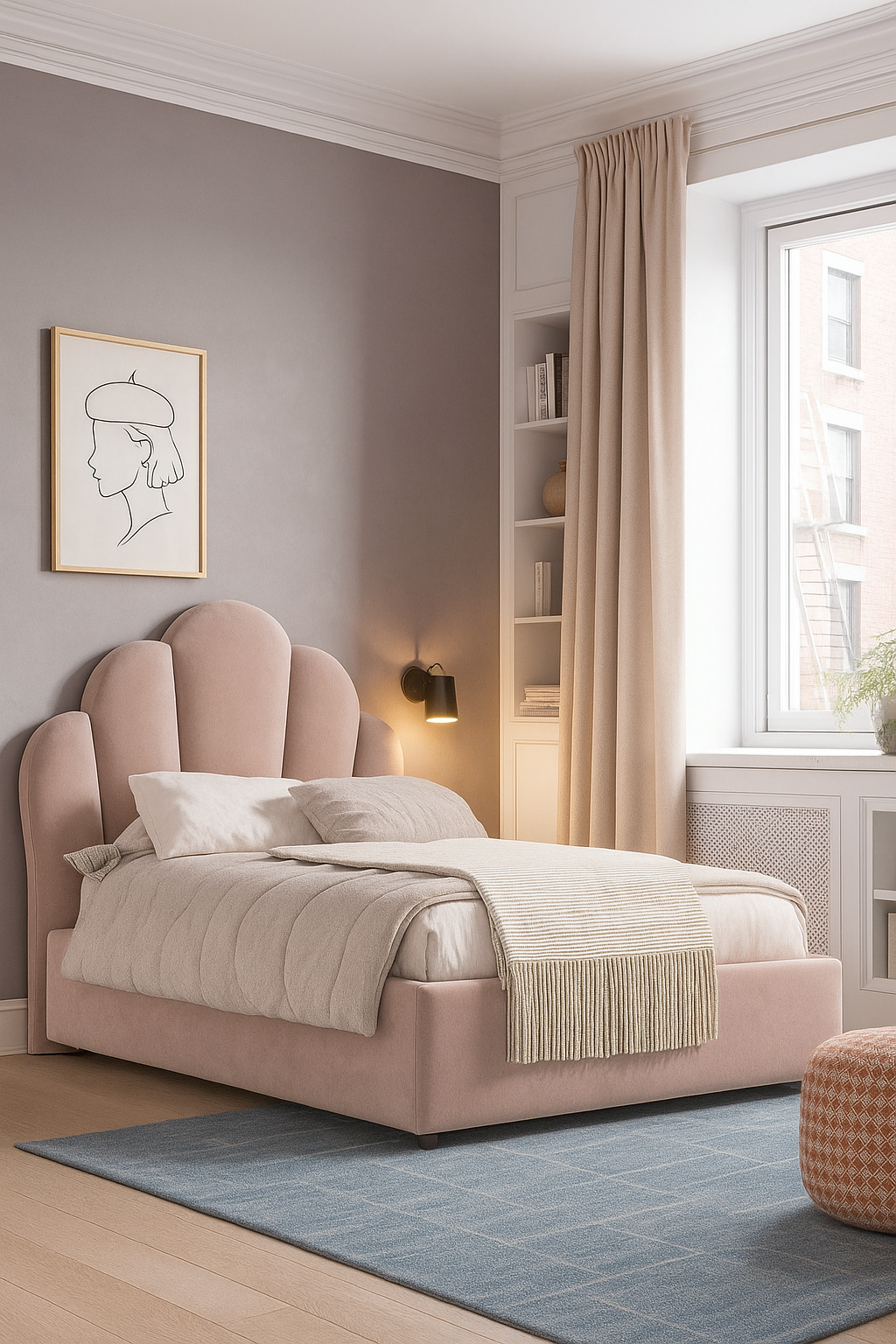 Дизайнерская кровать Ариэль жемчужина детской коллекции. Очень нежная, с мягкими линиями изголовья. Рисунок изголовья напоминает ракушку, или лепестки цветка, есть возможность фантазировать. Изделие на заказ имеет много плюсов, ведь любую модель можно адаптировать под ваши размеры, выбрать цвет и фактуру ткани. Выбор дизайнерских тканей в шоу-руме фабрики приятно вас удивит!