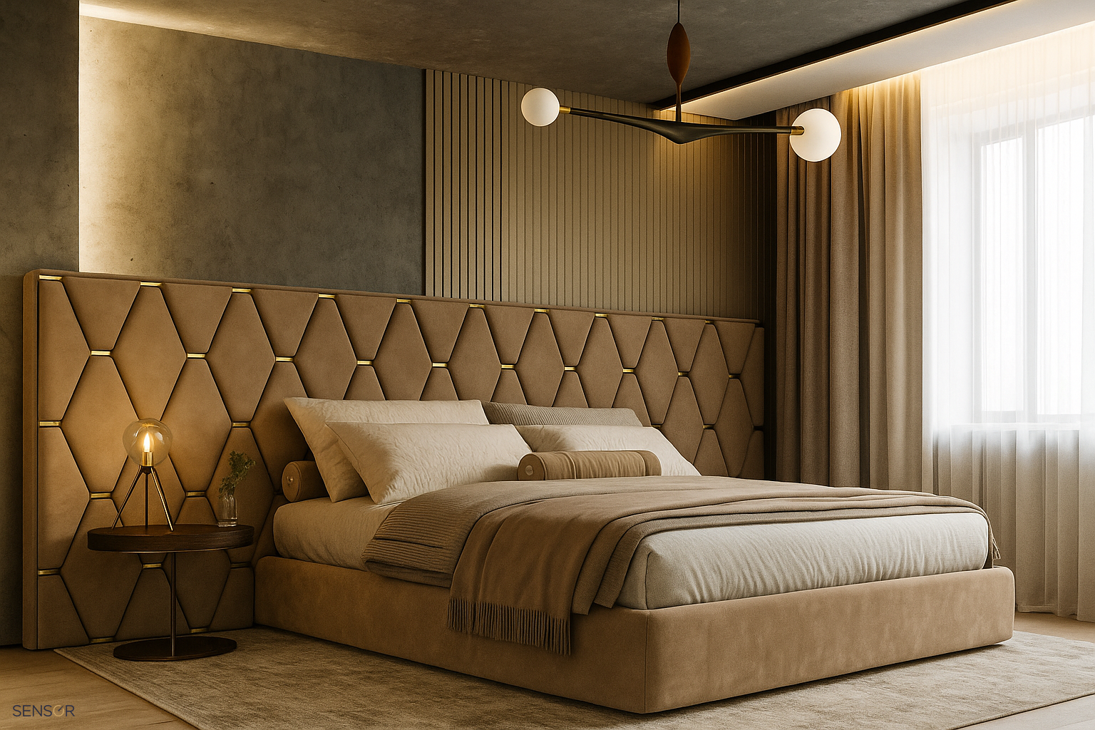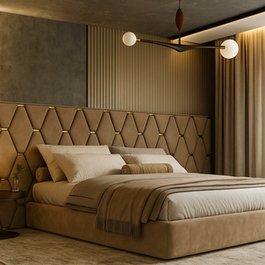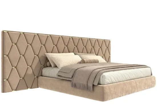 Кровать с широким изголовьем Барбера для стильной современной спальни. Удачное изголовье, особенно если оно спроектировано и изготовлено на заказ, может стать ярким и необычным акцентом в интерьере спальни. В кровати вы проводите треть жизни, так что уделите пристальное внимание тому, что будет окружать вас в это время. Изголовье, удлиненное на всю стену, визуально поглощает дополнительное пространство, делая обстановку более мягкой и уютной. А металлические вставки золото/серебро, блестящее или матовое, добавит шика!