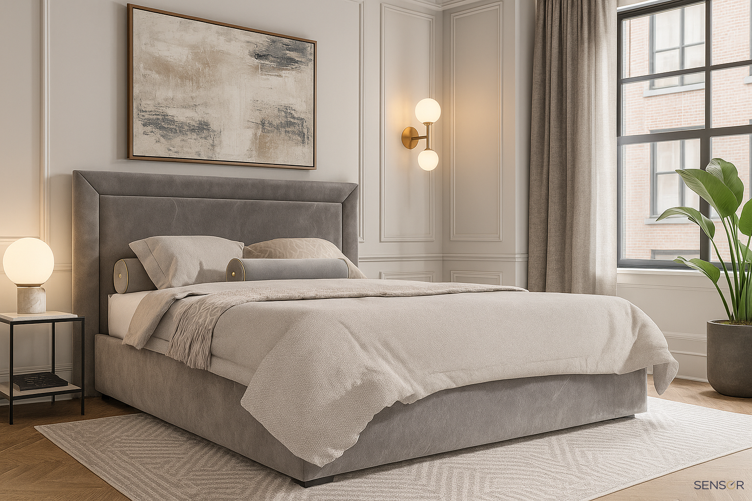 Хлоя - удобная мягкая кровать, лаконично, минималистично, что даёт возможность поиграть цветом, текстурами тканей. Декоративный молдинг из латуни по периметру изголовья смотрится очень элегантно.