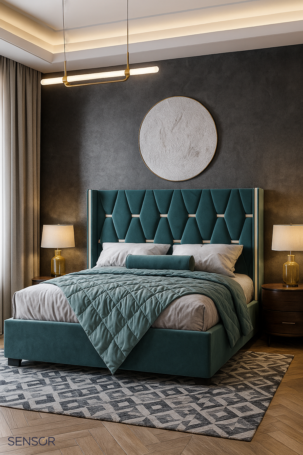 Кровать Фрателли Дизайн с геометрическим рисунком изголовья для современной спальни. Изящные вставки из металла (серебро/золото на выбор) смотрятся элегантно, добавляя шика. Боковые ушки создают ощущение уюта и защищённости, а металлические вставки стильно дополняют дизайн ушек. Мебель на заказ имеет целый букет преимуществ. Вы выбираете ткань по цвету и текстуре в шоу-руме фабрики, или менеджеры делают подборку тканей из шоу-рума. Мы работаем с ведущими поставщиками дизайнерских тканей в России. Любую модель можно подкорректировать по размерам спального места, по высоте изголовья, вписать в нужные параметры.