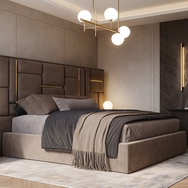Дизайнерская кровать с широким изголовьем Говард. Современное интерьерное решение, которое выглядит не только стильно, но и решает большую часть декорирования. На сон мы тратим около трети нашей жизни. Именно поэтому комфортная и изысканная кровать – лучший вклад в собственный отдых, и, следовательно, здоровье. Геометрические формы создают атмосферу упорядоченности и гармонии. Квадраты стильно дополняют прямоугольники, а средние и крупные формы прекрасно сочетаются. Каждый элемент изготавливается отдельно, а затем, по принципу мозаики выкладывается общий рисунок изголовья. Четкие линии, прямые углы прекрасно сочетаются со сдержанными современными стилями. Обратите внимание, изюминку добавляет металлический молдинг (на выбор золото, серебро). Рисунок изголовья адоптируется под ваши габариты, именно для вашей спальни, индивидуально. Дизайнер фабрики отрисовывает и согласовывает с вами эскиз перед запуском в работу.
