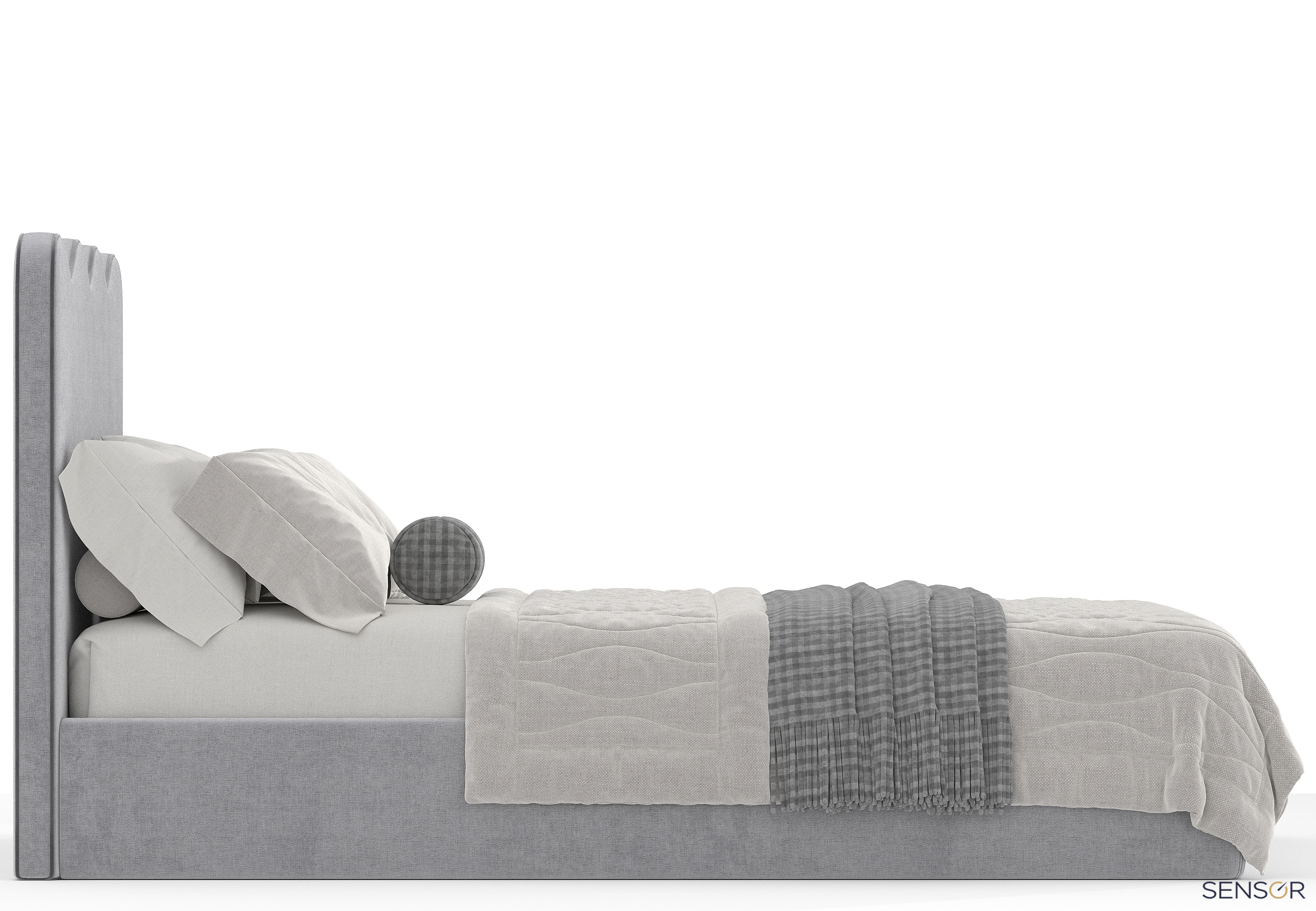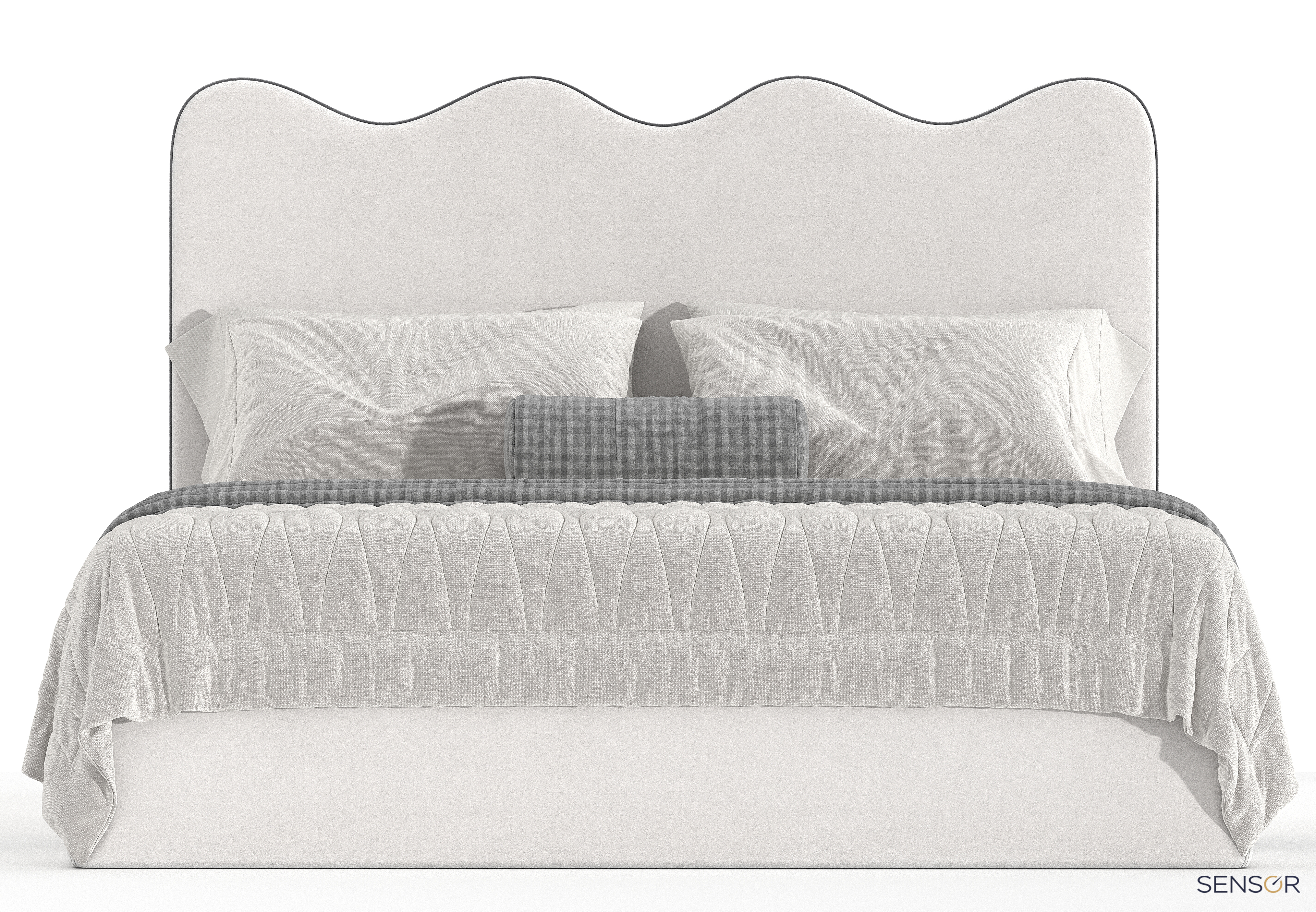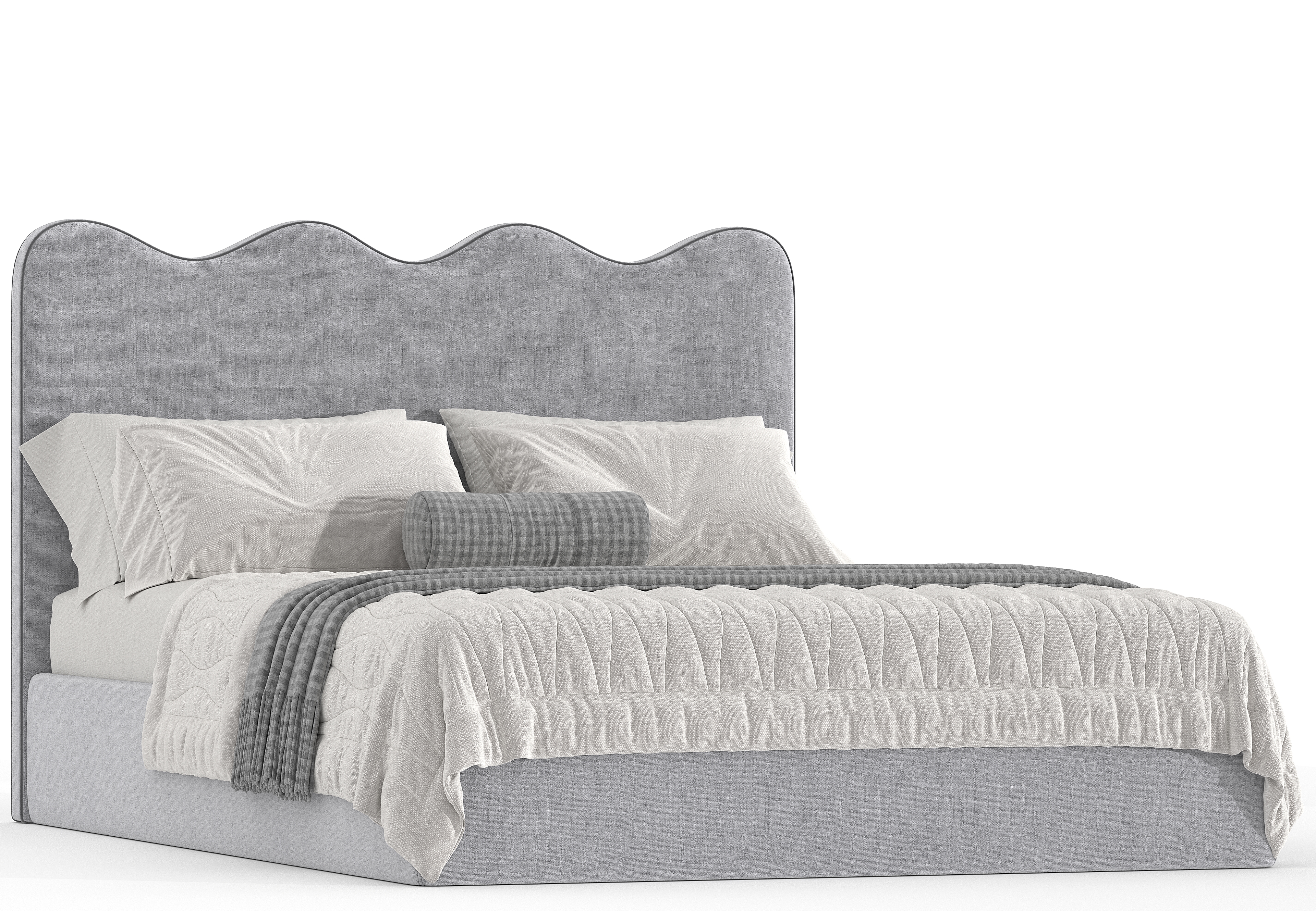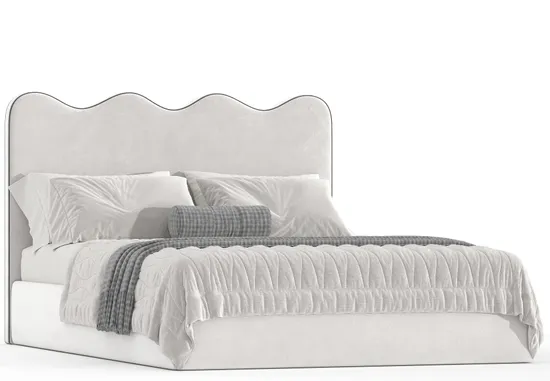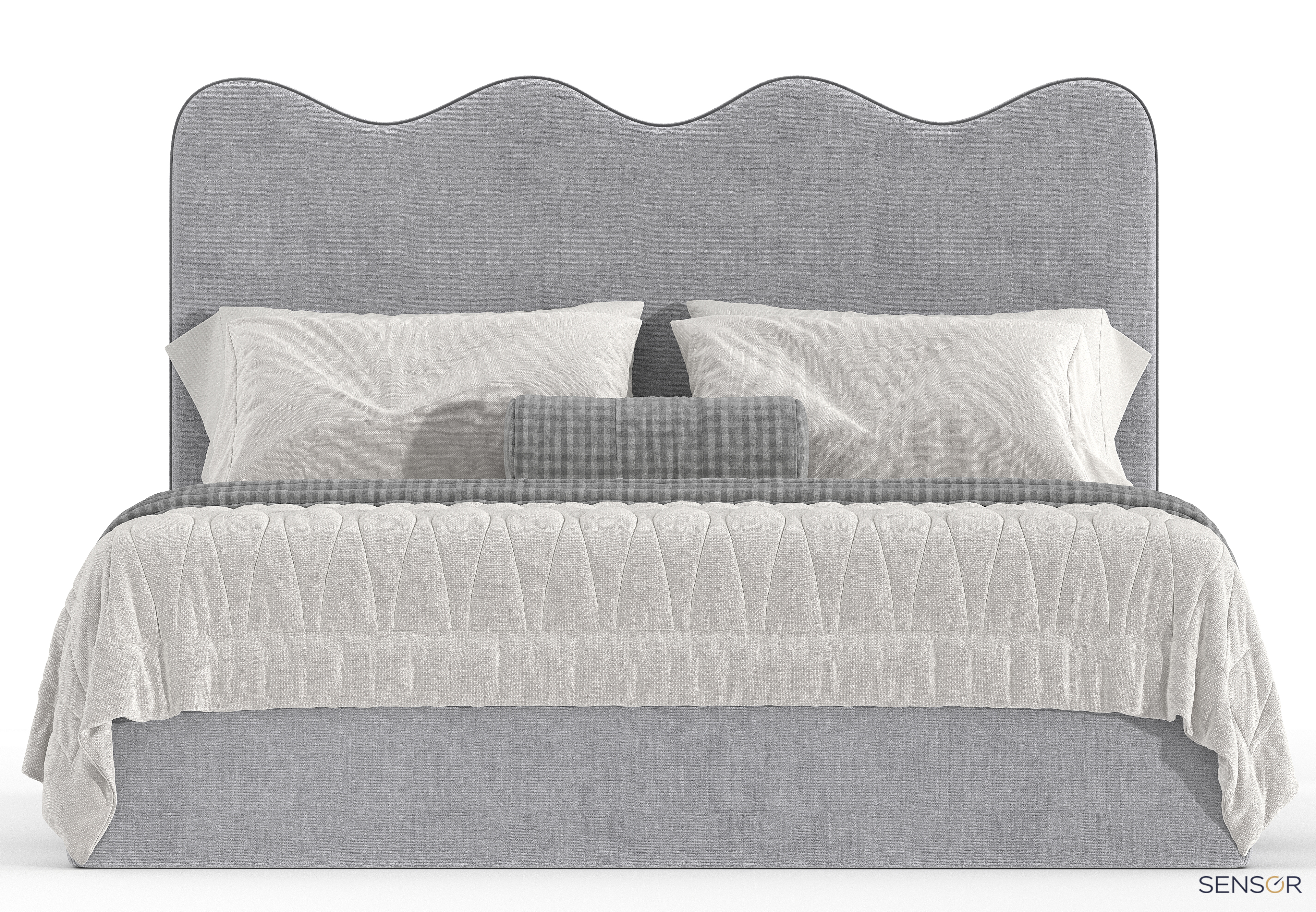 Дизайнерская кровать Космо Дизайн для современной спальни. Стильная, элегантная модель привлекает оригинальной формой изголовья. Форма изголовья похожа на волну, напоминает нам о природе, обтекаемые формы помогают расслабиться. Декоративный кант ещё один интересный элемент декора, его можно сделать как однотонным, так и уйти в контрастные варианты. Изготовление мебели на заказ даёт возможность адаптировать модель под размеры комнаты, подобрать необходимый цвет из большого каталога дизайнерских тканей.