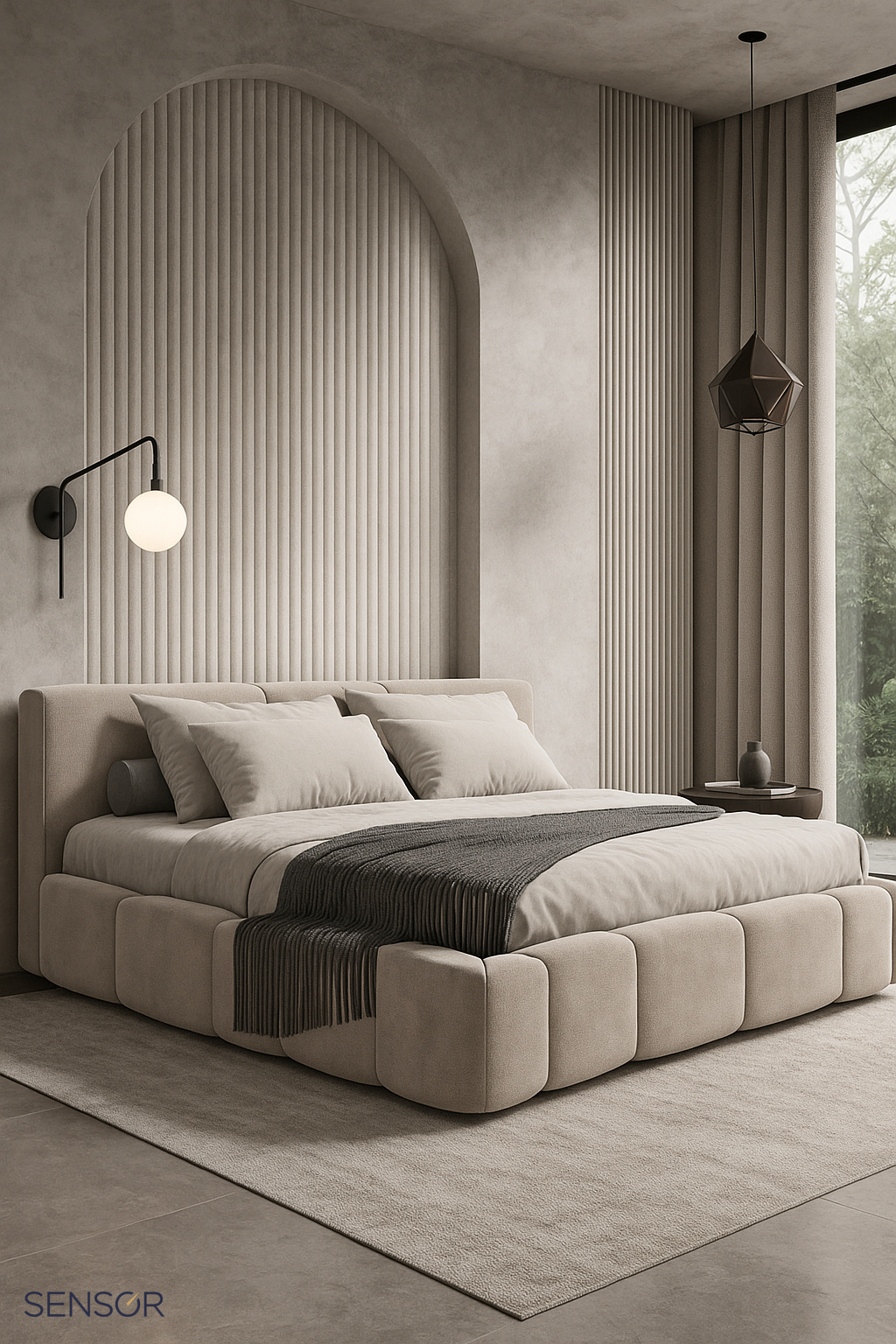 Кровать Лавсит для современной спальни. Модель с широкими бортами и заниженным толстым изголовьем. Минималистичный стиль. Изготовление на заказ даёт вам возможность вписать кровать по габаритам в размеры именно вашей комнаты. На выбор большая коллекция дизайнерских тканей по цвету и текстуре. Каркас кровати выполнен из качественных материалов. Уютная и комфортная модель.