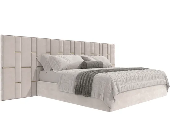 Кровать Лореаль с широким изголовьем под прикроватные тумбочки для современной спальни. Геометрические формы создают атмосферу упорядоченности и гармонии. Каждый элемент изготавливается отдельно, а затем, по принципу мозаики, выкладываются в общий рисунок изголовья. Четкие линии, прямые углы, прекрасно сочетаются со сдержанными современными стилями. Шика изделию придают металлические вставки (на выбор серебро,золото). Модель Лореаль идеально впишется в интерьер вашей спальни,и станет ее украшением, добавит уюта,мягкости и красоты! А конструкторы нашей фабрики адаптируют дизайн изголовья под ваши размеры, согласуют с вами технический эскиз. Изготовление мебели на заказ даёт вам возможность выбрать цвет и текстуру ткани из большого каталога дизайнерских тканей.