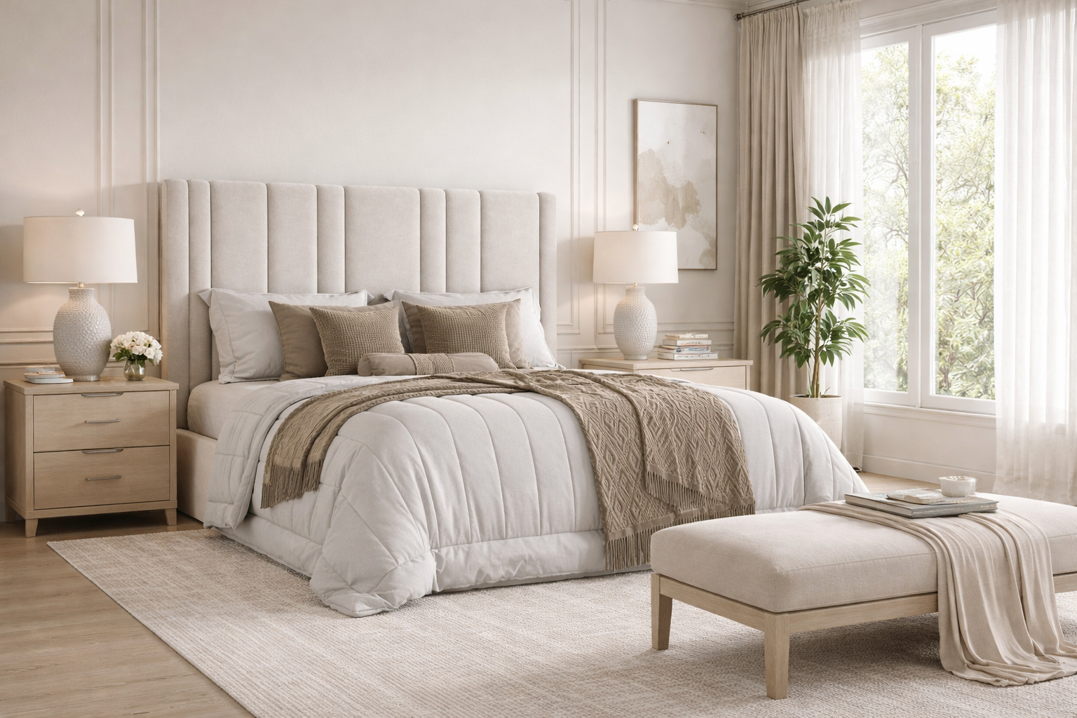 Дизайнерская кровать Массандра Дизайн для современной спальни. Полоска в интерьере — беспроигрышный декораторский прием. Во-первых, он всегда актуален и никогда не выходит из моды. Во-вторых, идеально вписывается в любой стиль. В третьих, помогает скрыть архитектурные недостатки помещения. Вертикальные полосы делают помещение выше. А изготовление кровати на заказ даёт возможность выбрать ткань изделия по текстуре и цвету, зафиксировать удобную для вас высоту (от 120 - 130 см) изделия, а так же изготовить кровать по вашим габаритам, которые идеально впишутся именно в вашу спальню!
