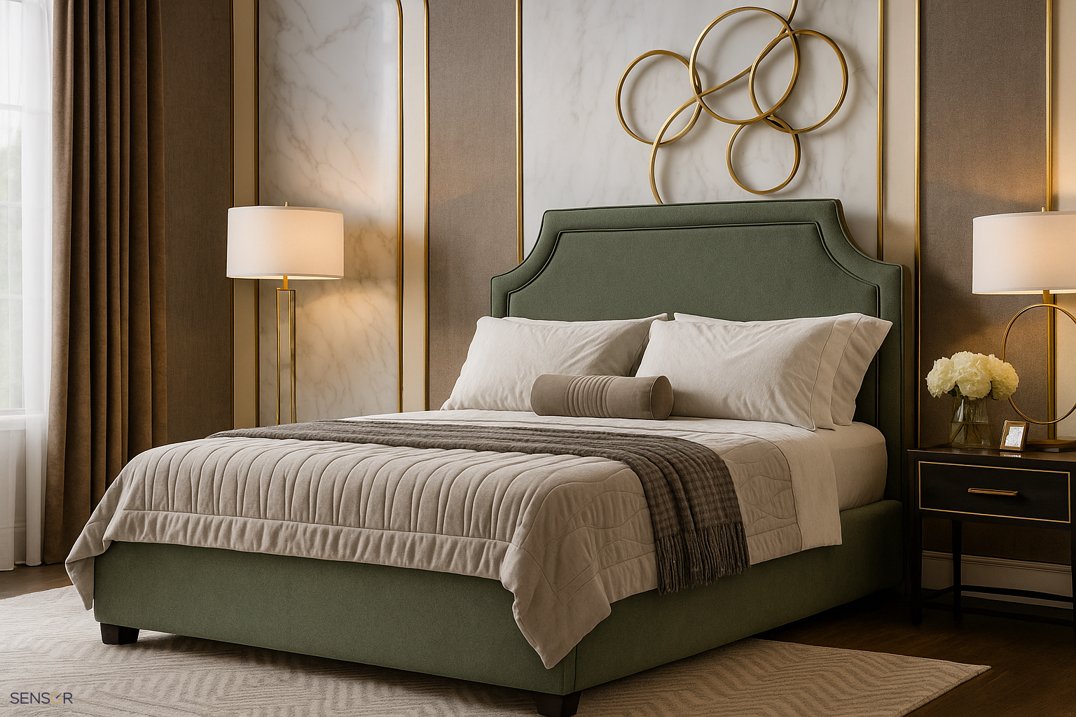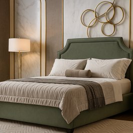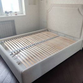 Двуспальная мягкая кровать Опрайм прекрасно впишется в современный интерьер спальни. Стильная авторская мебель по вашим размерам. Декоративный кант может быть как в цвет кровати, так и контрастным. А можно в качестве декора использовать элегантные декоративные гвозди, это изысканное украшение.