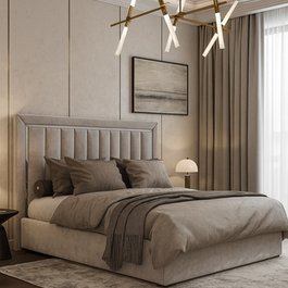 Дизайнерская кровать Шерлок с мягким изголовьем. Строгие вертикальные линии, дизайн простой, а значит, универсальный. Изголовье кровати, состоящее из вертикальных мягких секций даёт возможность визуально "приподнять" потолок и заставить небольшое помещение казаться выше. Особый шик добавляет металлический молдинг по периметру изголовья. Металл можно подобрать к ткани по цвету, это золото или серебро, а так же по ширине молдинга 1,2,3 см.