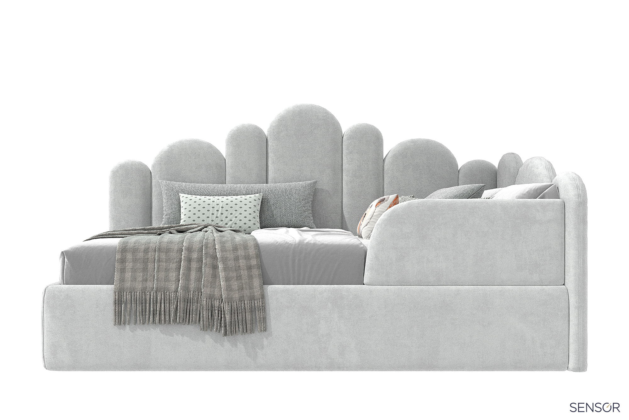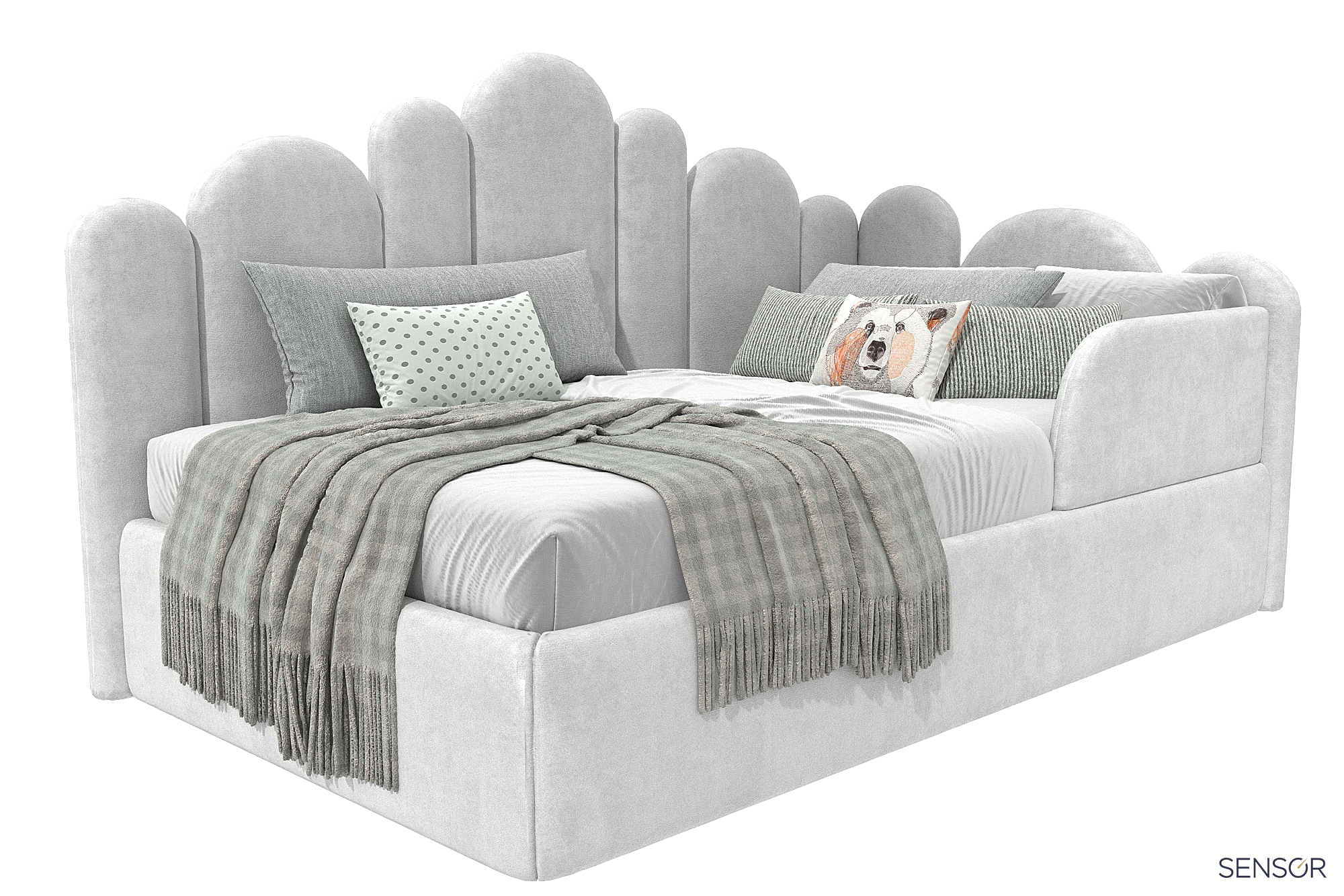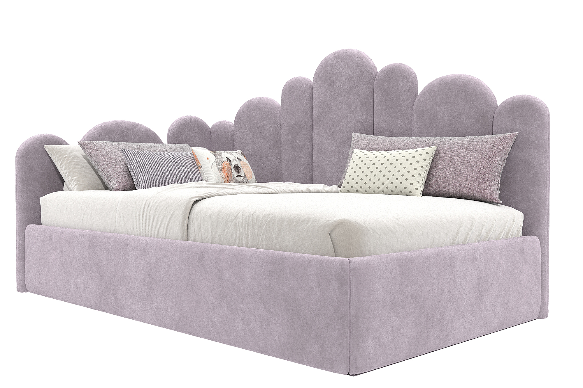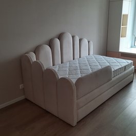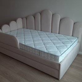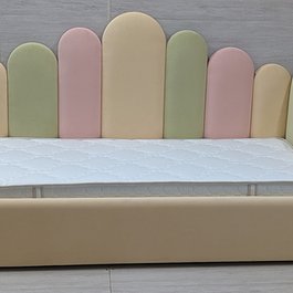 Угловая мягкая кровать Бамбини Дизайн для современной детской спальни. Универсальный дизайн изголовья подойдет как для девочки, так и для мальчика. Выбирая изготовление кровати на заказ, вы получаете возможность сделать её в нужных вам размерах, нужного вам цвета!