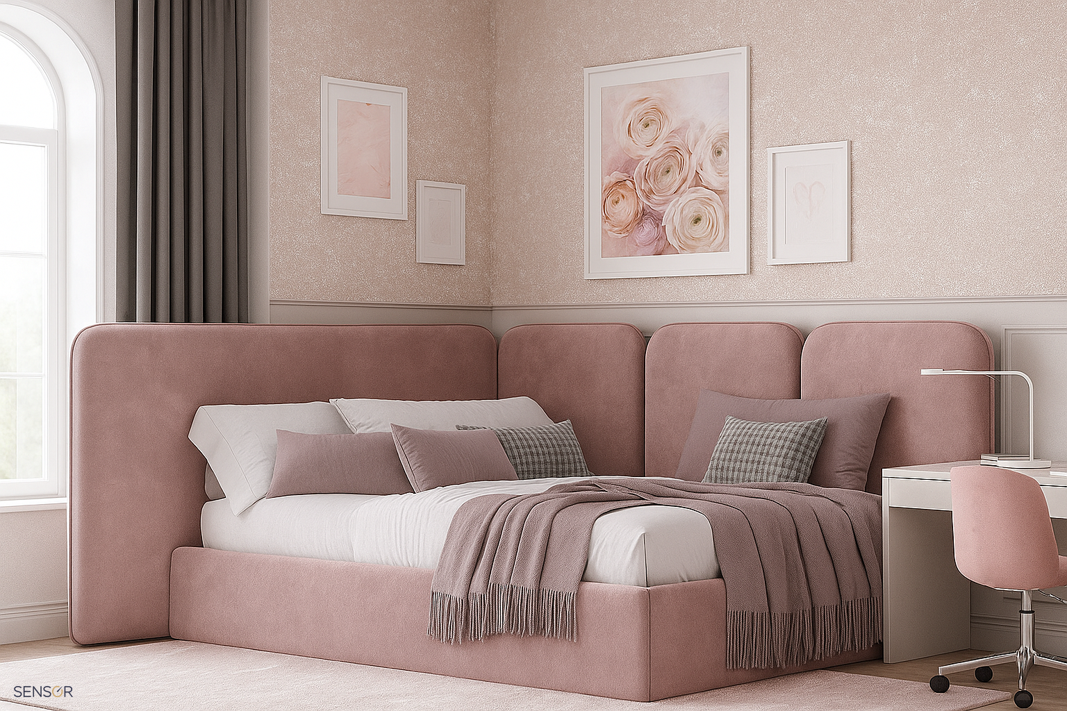 Угловая кровать Флит Дизайн проект №6 для современной деткой комнаты. Решение, привлекающее своей практичностью и выразительностью. Выверенные пропорции, использование экологичных гипоаллергенных материалов в основании каркаса и современных наполнителей – гарантия качества и удобства нашей мягкой мебели. Мы работаем с сертифицированными производителями мебельной ткани из России, Турции, Европы и Китая. Изготовление мебели на заказ дает вам возможность адаптировать любую модель из каталога фабрики под параметры вашей спальни.