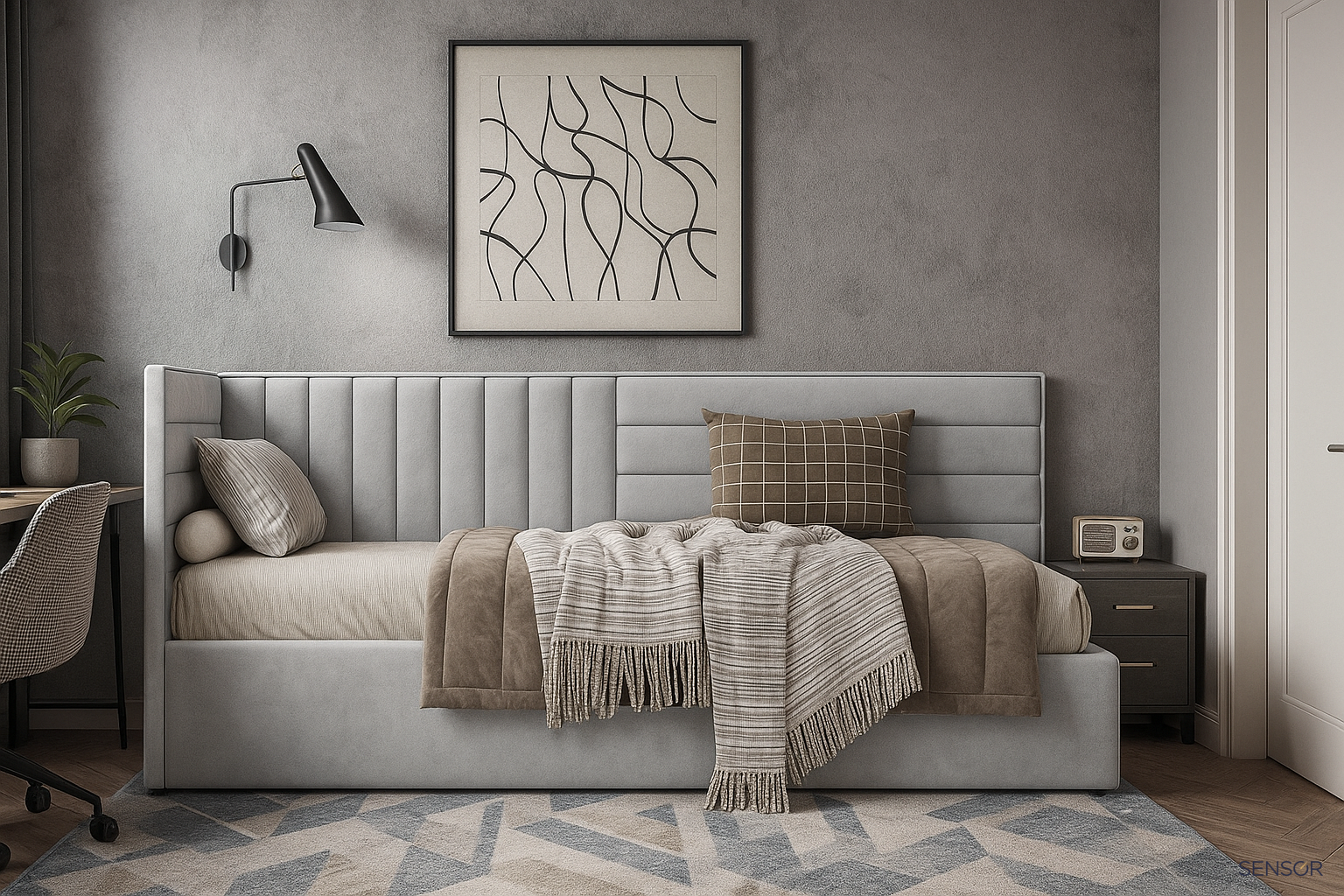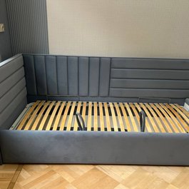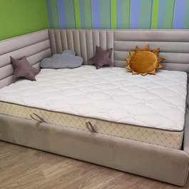 Угловая мягкая кровать Джуди - универсальный вариант для современной детской комнаты. Геометрические формы создают атмосферу упорядоченности и гармонии. Вертикальные полосы стильно сочетаются с горизонтальными. Каждый элемент изготавливается отдельно, а затем, по принципу мозаики выкладывается общий рисунок изголовья. Четкие линии, прямые углы подчеркивают современный стиль. Модель подойдет для любого возраста, как для девочки так и для мальчика.