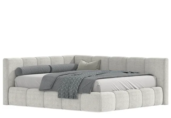 Кровать угловая Лавсит для современной детской  спальни. Модель с широкими бортами и заниженным толстым изголовьем. Минималистичный стиль. Изготовление на заказ даёт вам возможность вписать кровать по габаритам в размеры именно вашей комнаты. На выбор большая коллекция дизайнерских тканей по цвету и текстуре. Каркас кровати выполнен из качественных материалов. Уютная и комфортная модель.
