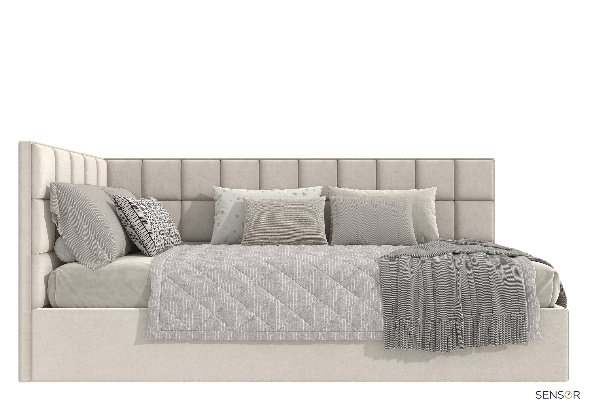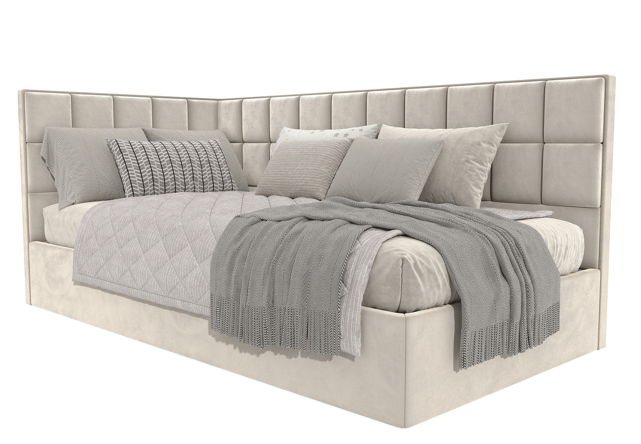 Квадро kids - угловая кровать для детей имеет строгую геометрическую форму, которые состоят из мягких квадратов. Они создают объем лаконичной спинке. С помощью уникальной технологии производства декоративных квадратных элементов, можно каждый квадрат выполнить в ткани различной как по цвету, так и по фактуре. Что позволит создать индивидуальный дизайн кровати.