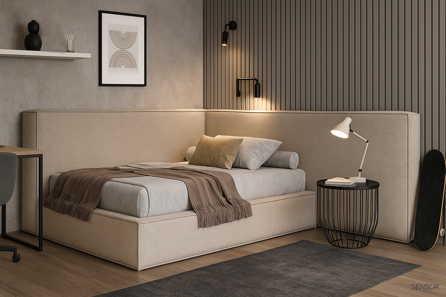 Угловая кровать Сохо Дизайн для современной деткой комнаты. Решение, привлекающее своей практичностью и выразительностью. Выверенные пропорции, использование экологичных гипоаллергенных материалов в основании каркаса и современных наполнителей – гарантия качества и удобства нашей мягкой мебели. Мы работаем с сертифицированными производителями мебельной ткани из России, Турции, Европы и Китая. Изготовление мебели на заказ дает вам возможность адаптировать любую модель из каталога фабрики под параметры вашей спальни.