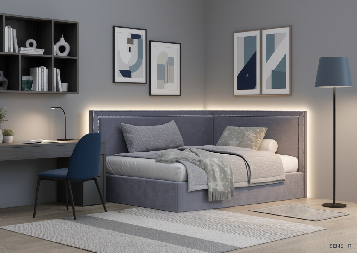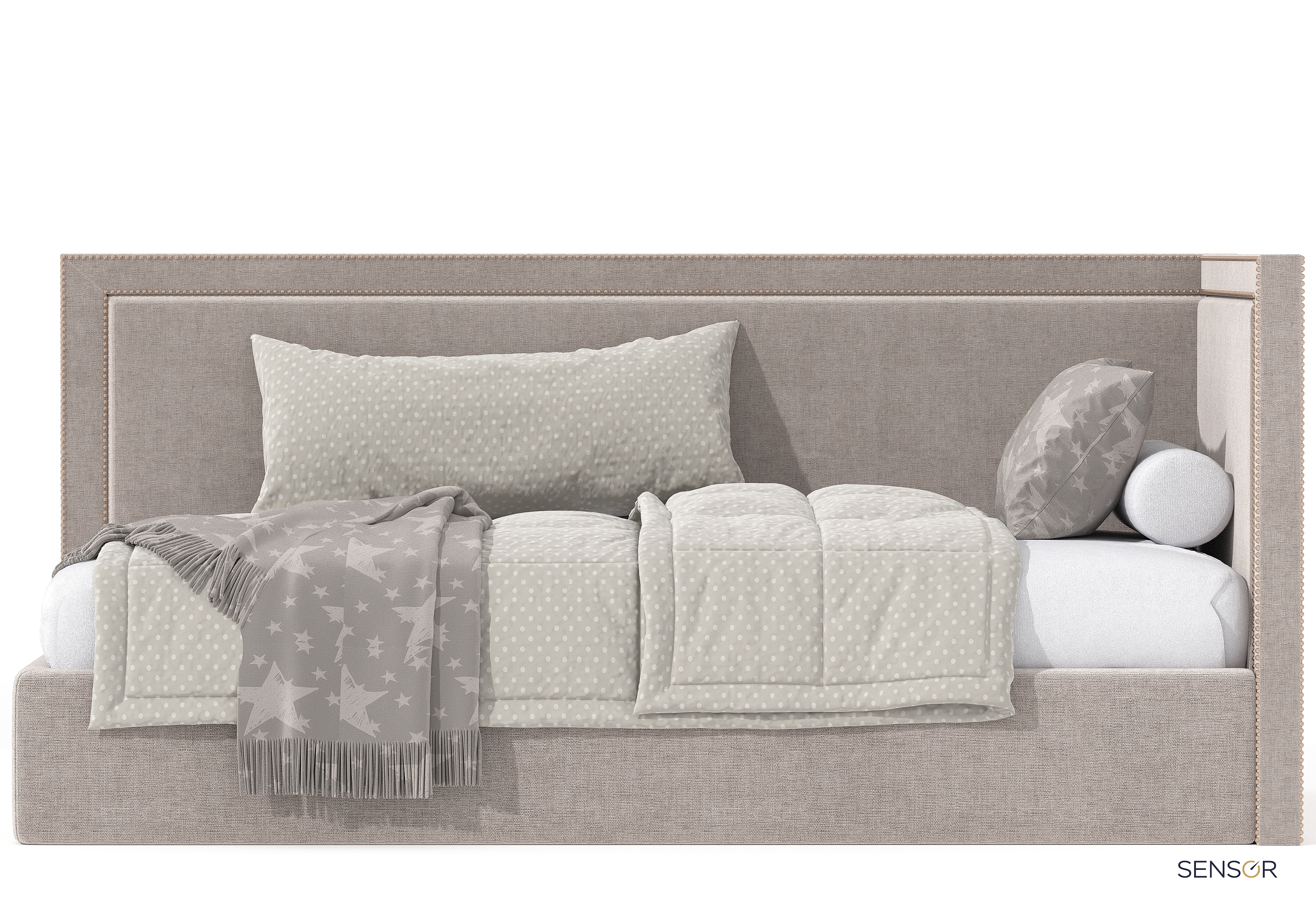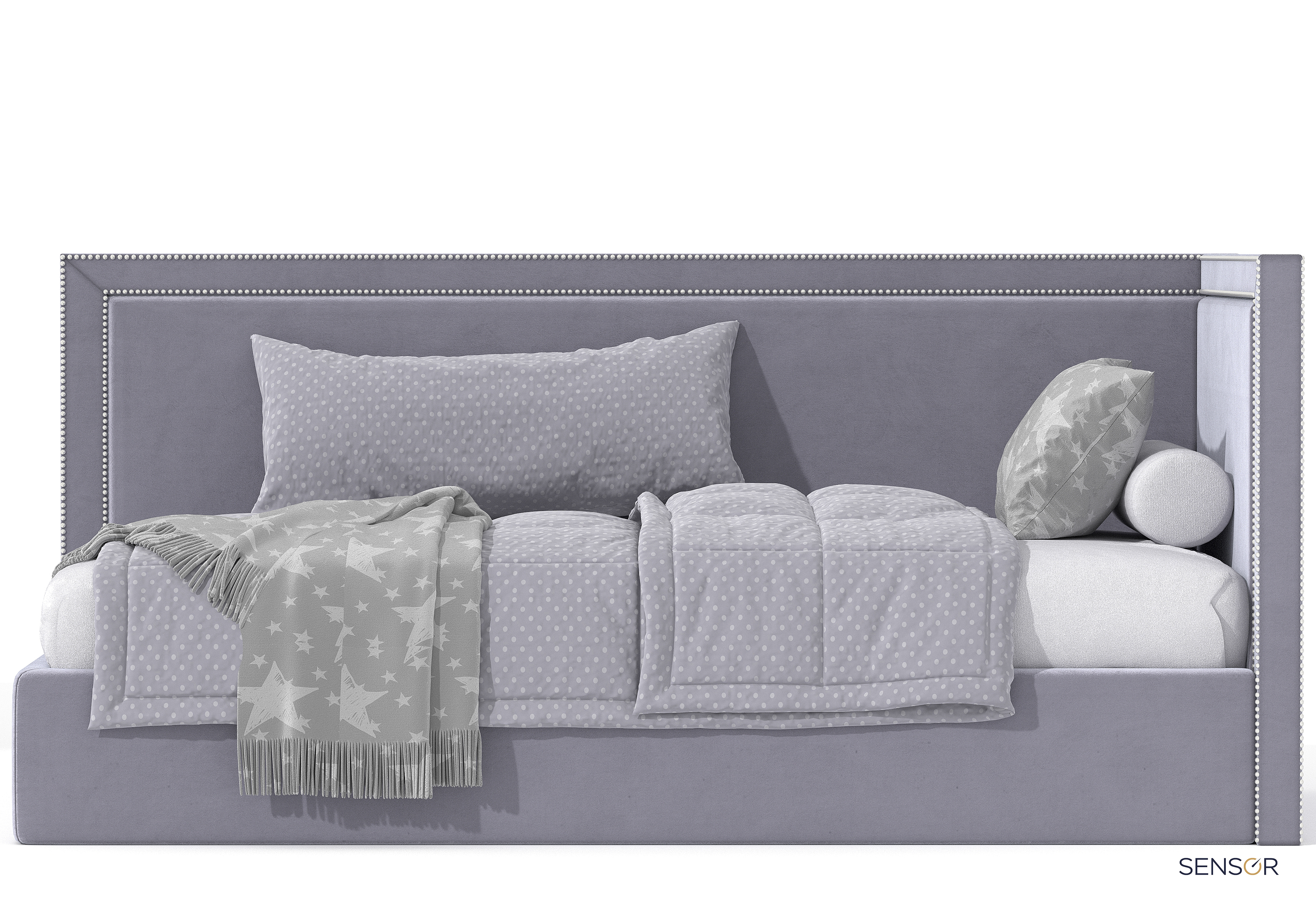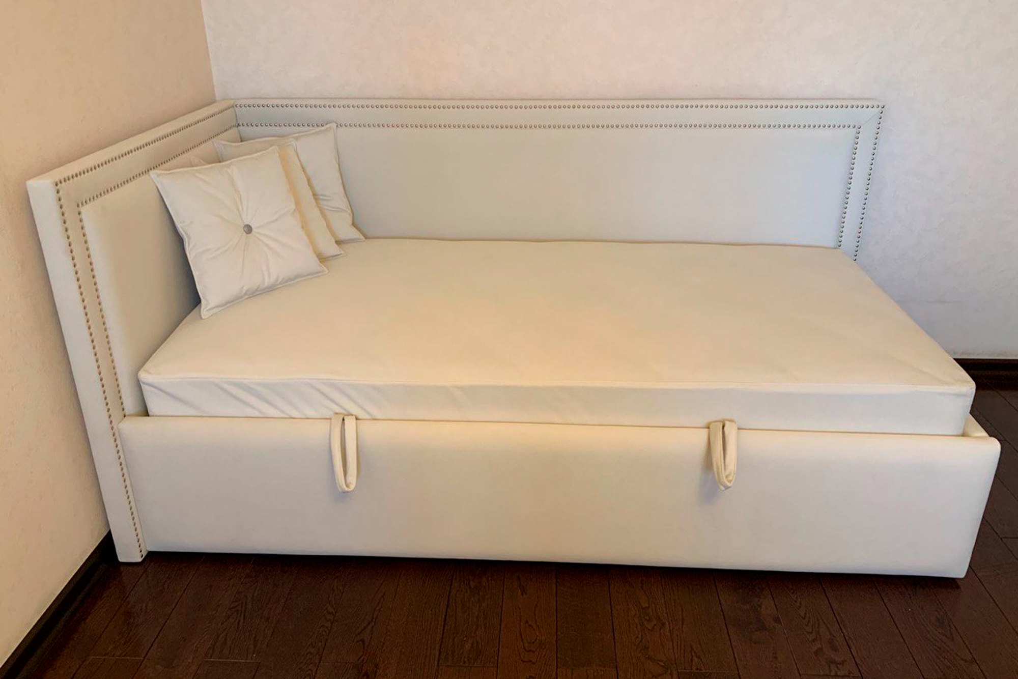 Угловая кровать Стелс kids с простым лаконичным дизайном. Основной изюминкой данной модели является декоративная отделка из металлических гвоздиков.